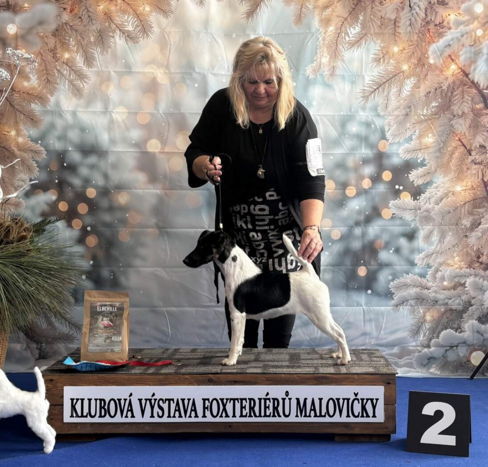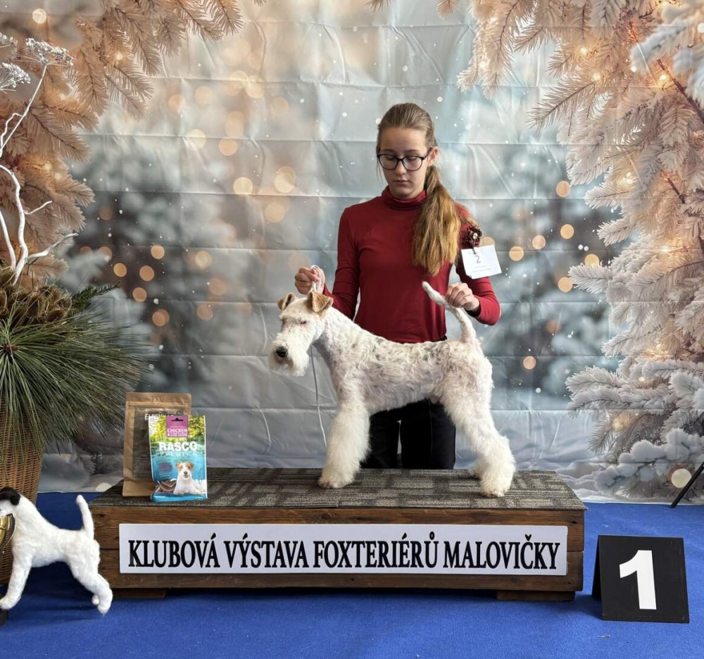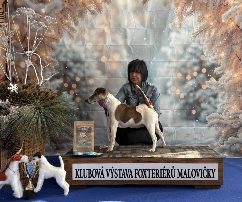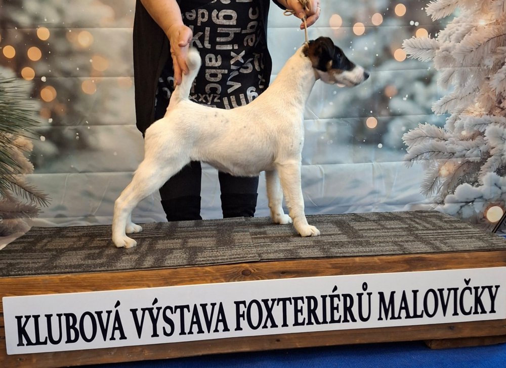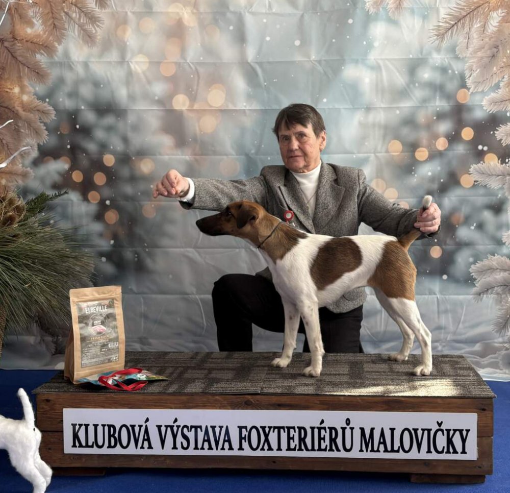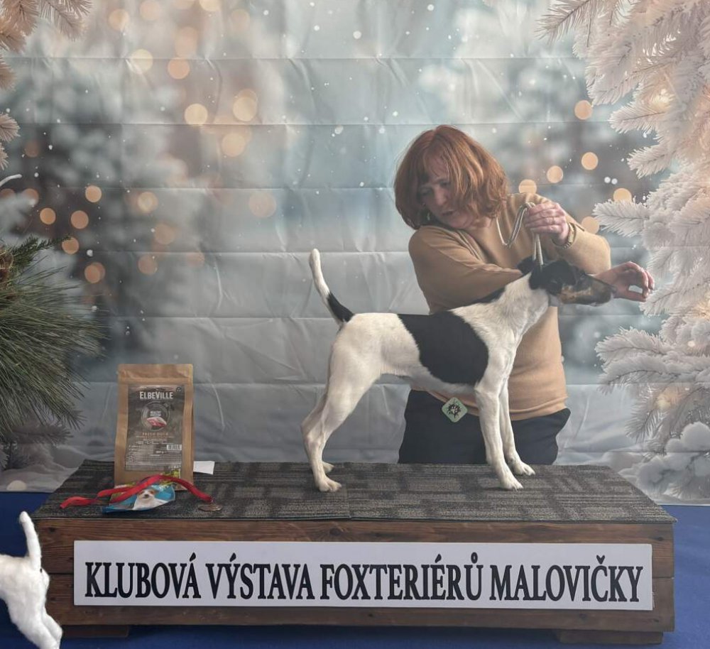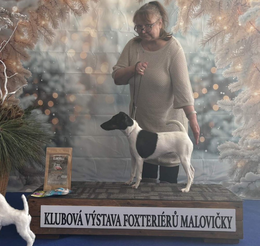 roční fena, na věk již zcela vyvinutá fena, na horní hranici výšky, pěkná samičí hlava, ucho by mělo být výše nasazené a výše lomené, tmavé oko, nůžkový skus, krk dobré délky, prut mohl být výše nasazen, žebra dobře rozložená ale kulatější, méně vydatné úhleni obou párů končetin, korektní hladká srst, méně vydatný pohyb obou párů končetin, vzadu úzký, v pohybu prut výrazně přes hřbet, velmi pěkně předvedená
