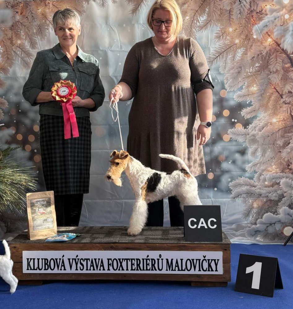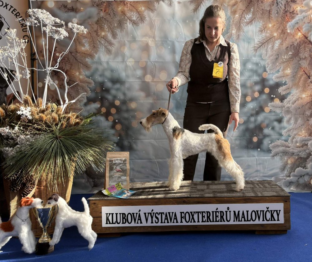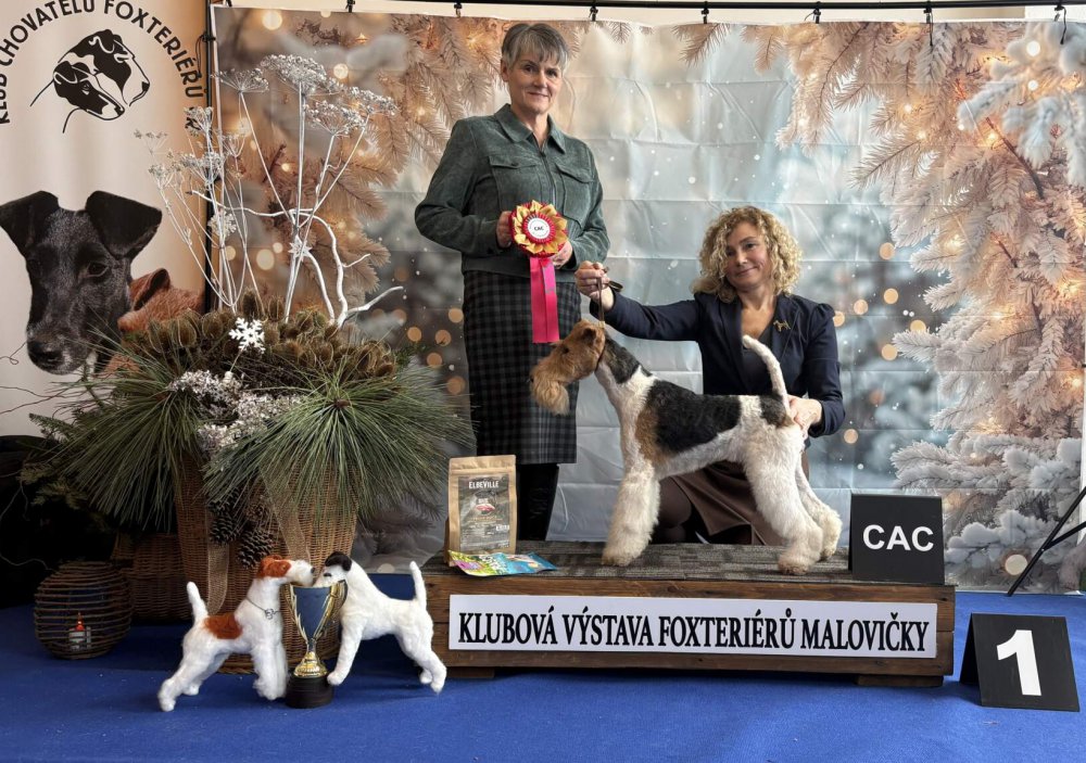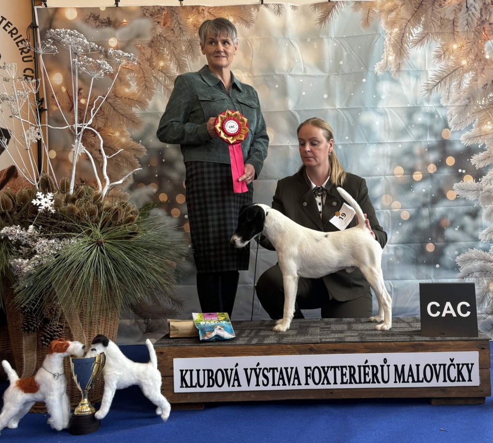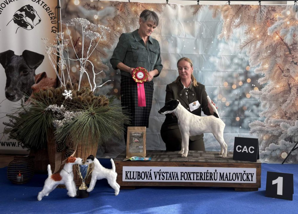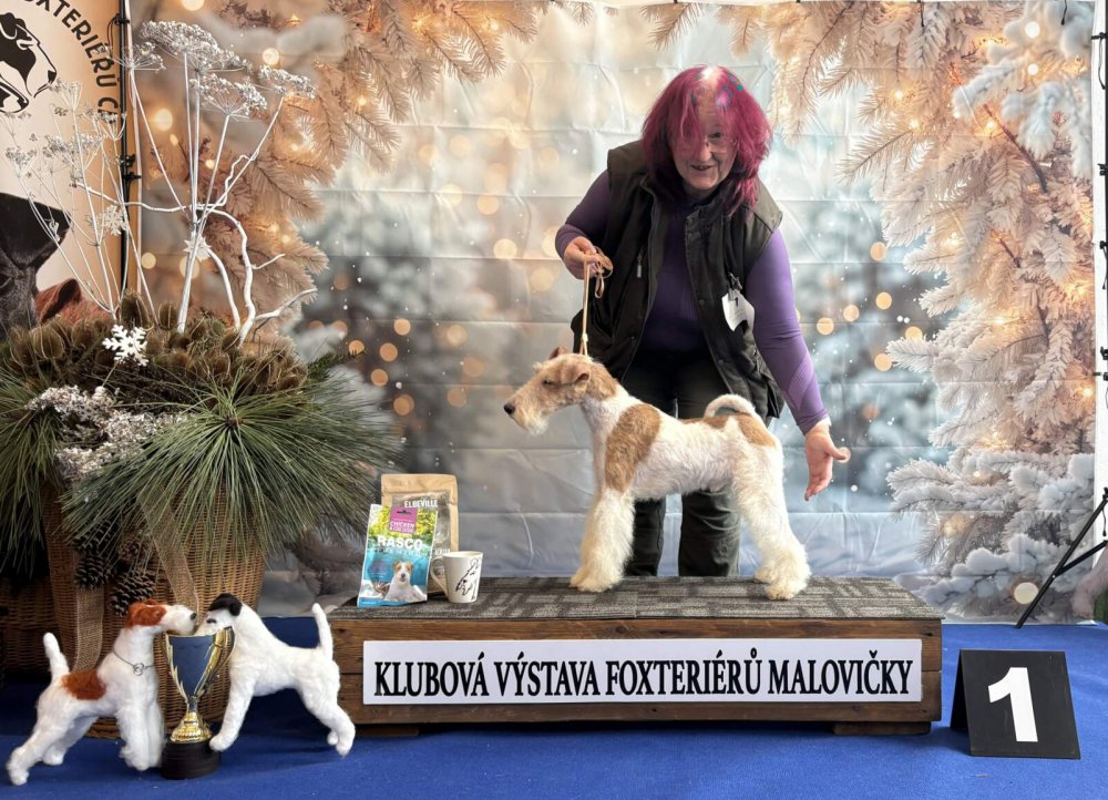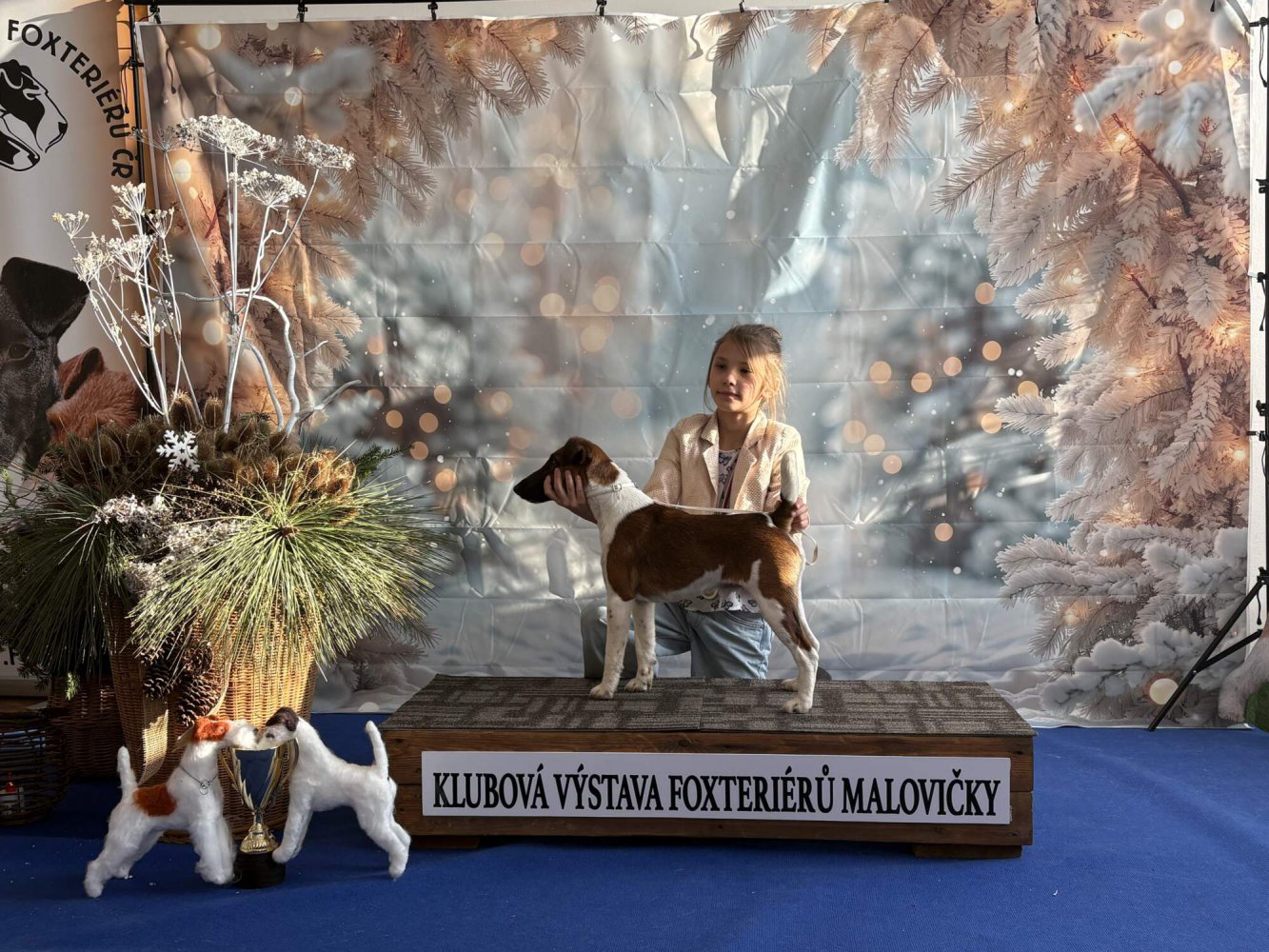 roční fena, na věk již zcela vyvinutá fena, na horní hranici výšky, pěkná samičí hlava, ucho by mělo být výše nasazené a výše lomené, tmavé oko, nůžkový skus, krk dobré délky, prut mohl být výše nasazen, žebra dobře rozložená ale kulatější, méně vydatné úhleni obou párů končetin, korektní hladká srst, méně vydatný pohyb obou párů končetin, vzadu úzký, v pohybu prut výrazně přes hřbet, velmi pěkně předvedená