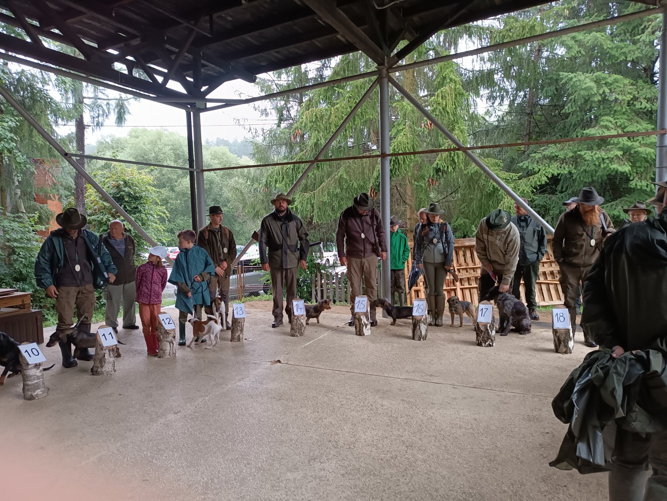 Dne 6. srpna 2023 uspořádali Klub chovatelů foxteriérů, Klub chovatelů teriérů ve spolupráci s Okresním mysliveckým spolkem ve Zlíně Klubové zkoušky k vyhledávání, vyhánění a nadhánění spárkaté zvěře. Pro plemena zastřešená pod výše uvedenými chovatelskými kluby se jednalo o zkoušky s možností udělení titulů čekatelství českého šampionátu práce (CACT) a klubových šampionátů práce (CT nebo CCT). Zkoušky se uskutečnily v honitbě MS Vrchovina Hvozdná, kde již v minulosti s úspěchem opakovaně probíhaly naše klubové zkoušky. Sbor rozhodčích pod vedením Jana Martoniho posuzoval ve složení: Leopold Šenkeřík, Zdeněk Jakuba, Ing. Šárka Adlová, Ing. Pavel Zuzaník, Zdeněk Šťastný a Marcel Martinek. Již dávno před konáním akce bylo zřejmé, že po celou dobu zkoušek nás bude provázet trvalý déšť, což se jen potvrdilo. Nicméně na předvedené výkony to nemělo příliš negativní vliv, neboť leče byly bohatě zastoupeny černou a srnčí zvěří. Zkoušek se zúčastnilo celkem osmnáct psů. Ke klubovým zkouškám nastoupili tři borderteréři, dva foxteriéři hladkosrstí a foxteriér drsnosrtý. Skladba plemen ostatních zástupců byla více než bohatá, zahrnovala jezevčíky, jagdteriéry i zástupce plemen honičů.