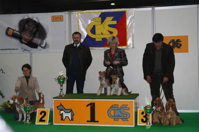 Třída šampionů UZZU STAR FRANKE ČLP/FXD/33182/07 *8.2.2006 o: Black Star Franke m: Ugata Star Franke ch: František Polehňa, Uherský Ostroh m: RNDr. Leona Vařechová, Pardubice Oko tmavé, skus nůžkový, elegantní výrazný pes, typický představitel plemene, správná hlava a ucho, výborná horní linie, správné zaúhlení vpředu i vzadu, správný pohyb, správná srst. Výborná 1, CAC, CACIB |