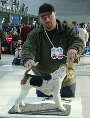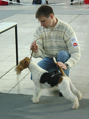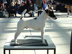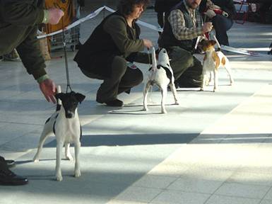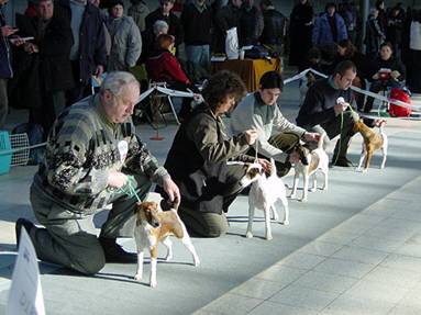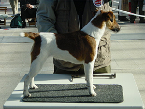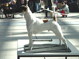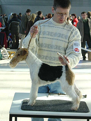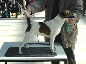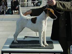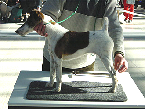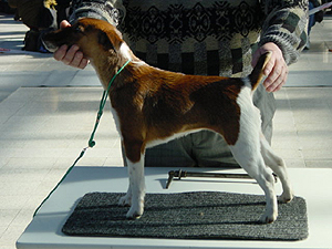 mírně nepřiléhavým uchem, krátký hřbet, prut dobře nasazen i nesen, dobré zaúhlení hrudních i pánevních končetin, vpředu jde mírně