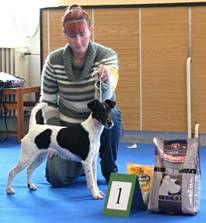 Jemnější v kostře, bikolorní fena, s výbornou dlouhou, úzkou hlavou, velmi dobrá horní linie, správně nasazený a nesený prut, pevná přední fronta, úhlení pánevních končetin v pořádku. Ne zcela ideální struktura srsti.(Nepodrostlá).