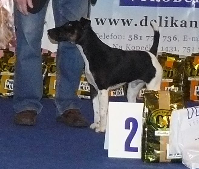 Fena správné velikosti, s výbornou hlavou korektním uchem, s výraznou horní linií, pevným hřbetem, výborně nasazený prut, správné úhlení obou párù končetin, užší chod vzadu, správná úprava, elegantní předvedení.