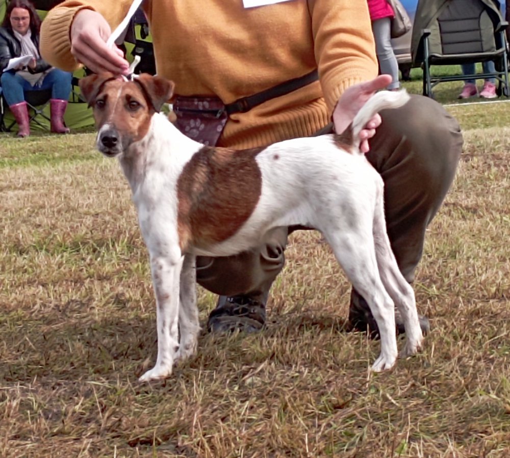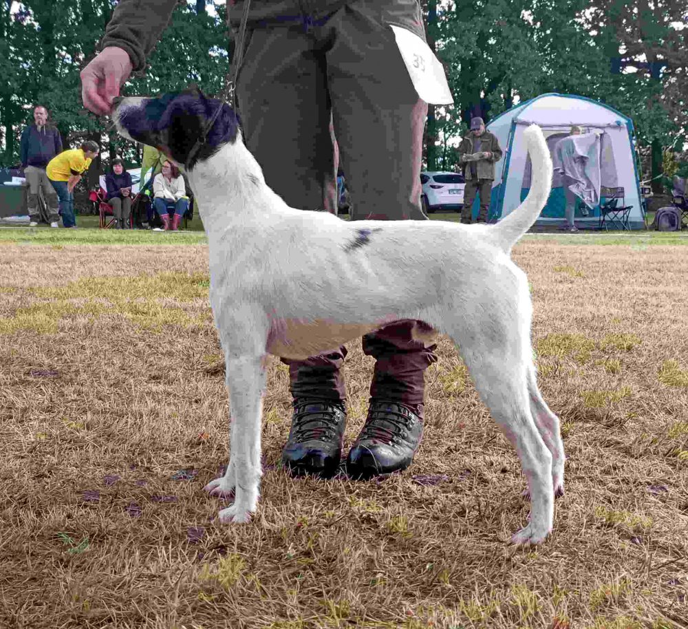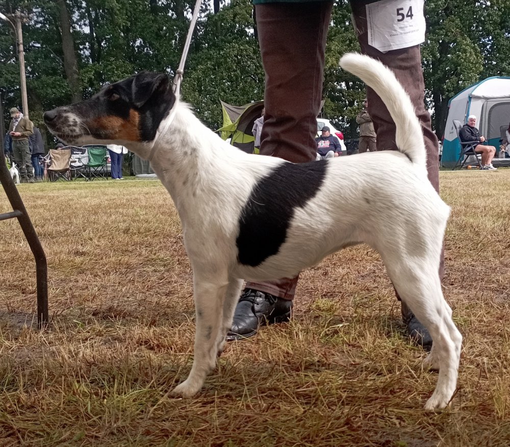 Fena na horní hranici výšky, hlava je OK, lebka by mohla být užší, hezké uši a výraz, hezká horní linie, hřbet by mohl být trochu kratší dostatečné nasazení ocasu, fronta by mohla být užší a tlapky silnější, úhlení vzadu je OK