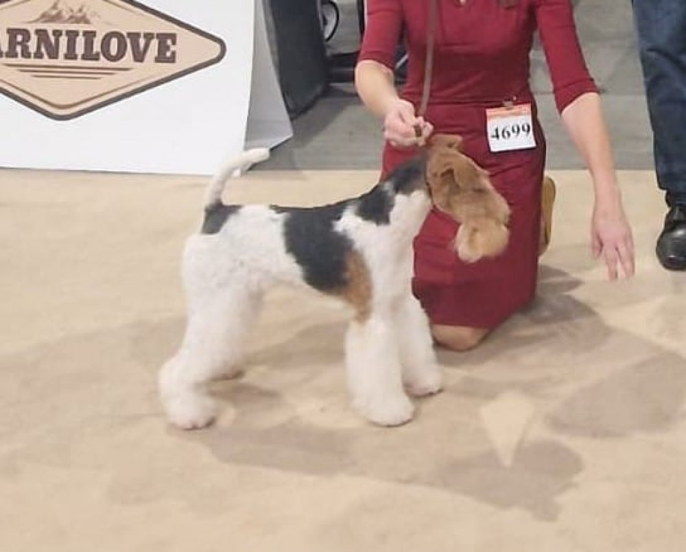 2 letá fena spr velikosti i rámce, pěkně modelovaná hlava, nůžk skus, tmavé oko, výb nasazené a nesené slecho, spr horní linie, korektní hrudník, spr úhlení, temperamentní povaha a pohyb, vzadu mírně sbíhavý