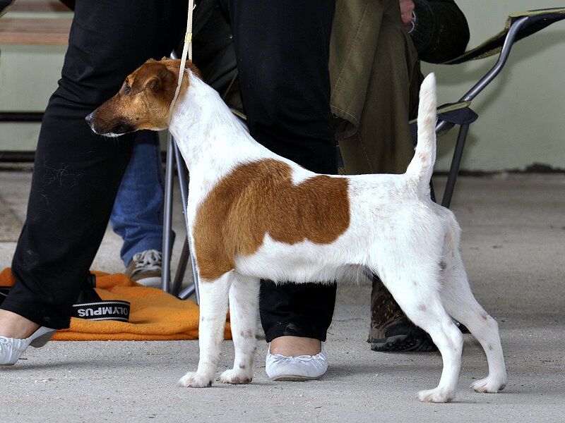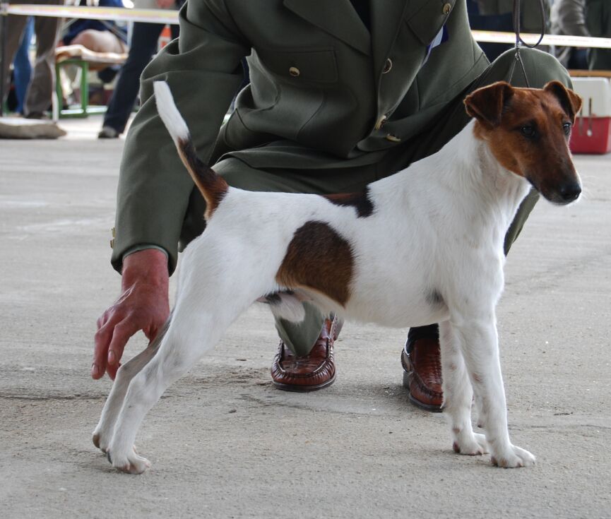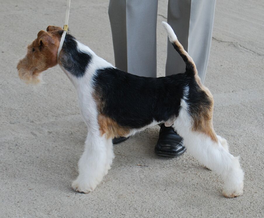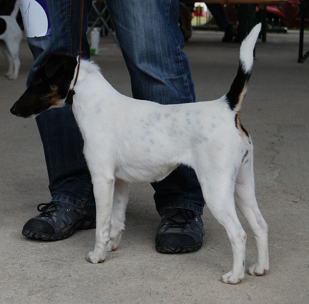 3 roky starý temperamentní pes menšího rázu, dlouhá hlava, dobře nasazené a nesené ucho, správná horní linie, vysoko nasazený a dobře nesený prut, správné zaúhlení vzadu, v pohybu korektní, zcela nevhodná úprava srsti.